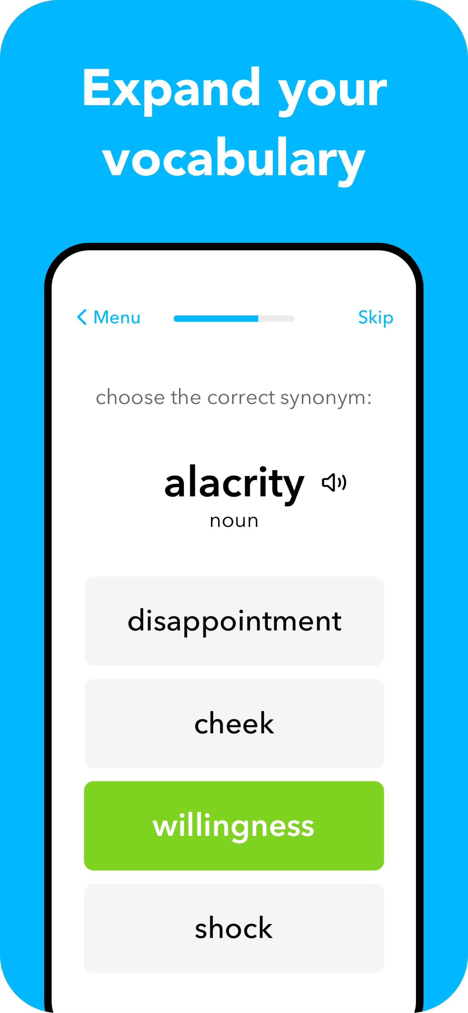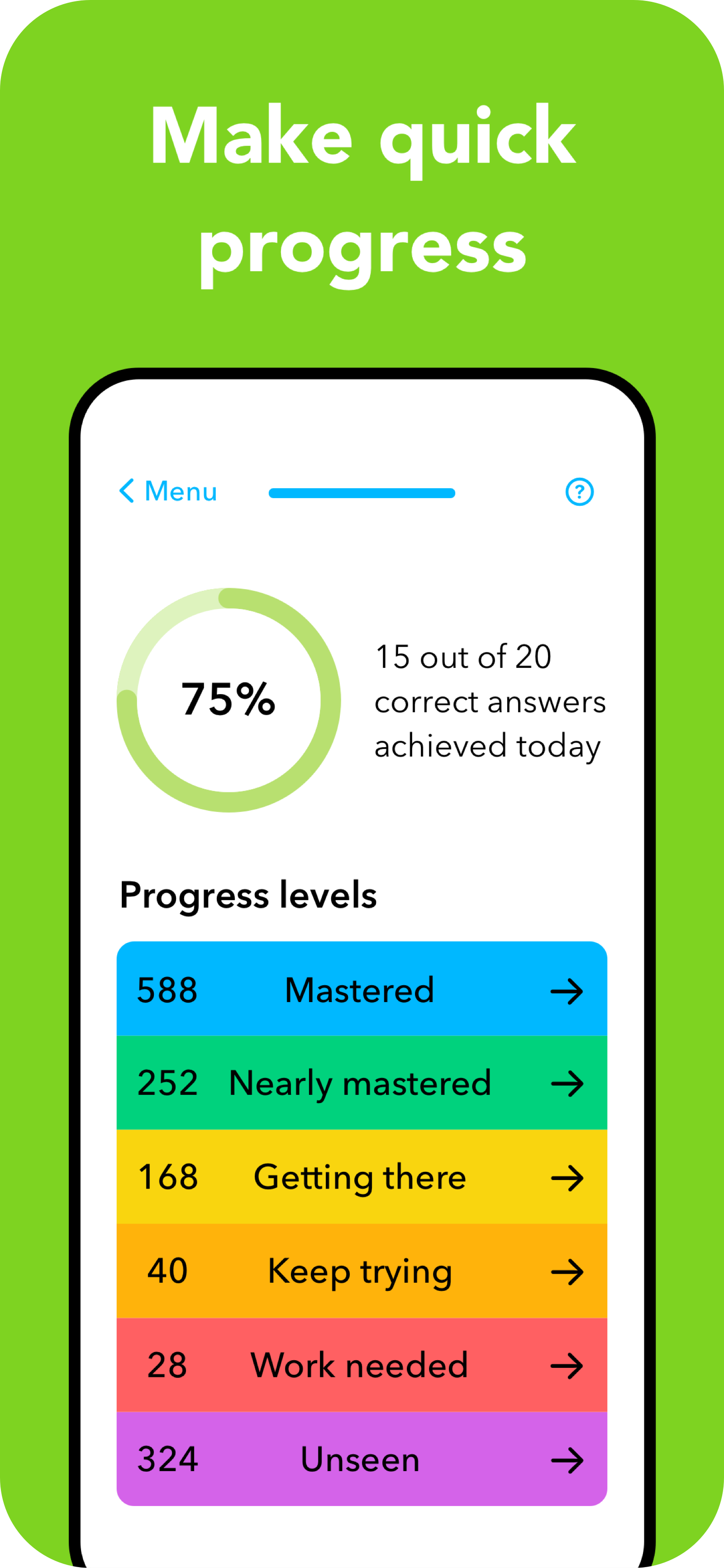 We keep track of your progress for every word and our intelligent algorithm uses this to decide which words to show you next. We focus on helping you master as many words as quickly as possible so all you need to do is open the app and start having fun.