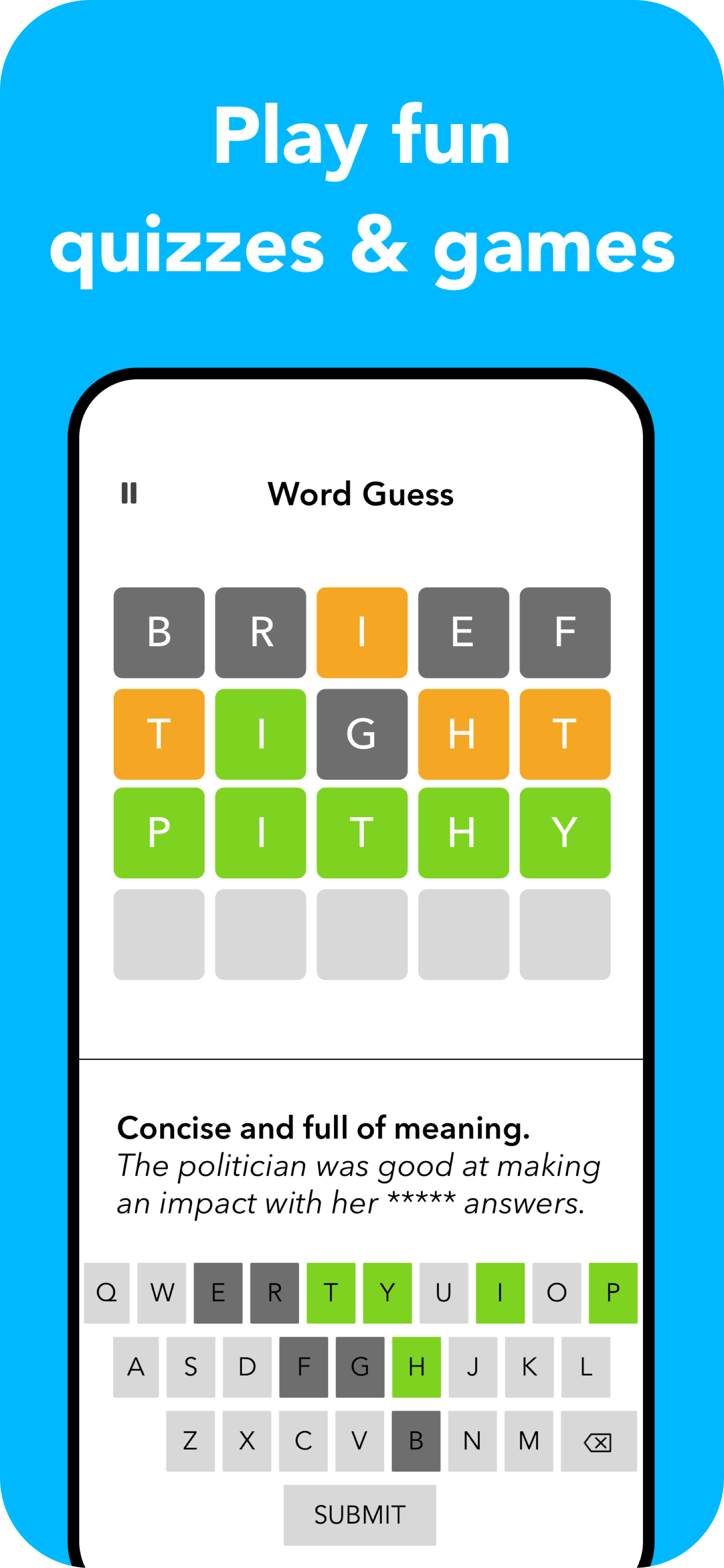 We understand that traditional methods for learning vocabulary can be boring and tedious. WordPal’s not like that. Quizzes and games are at the forefront of the learning experience, making improving your vocabulary something you can get excited about and have fun doing.